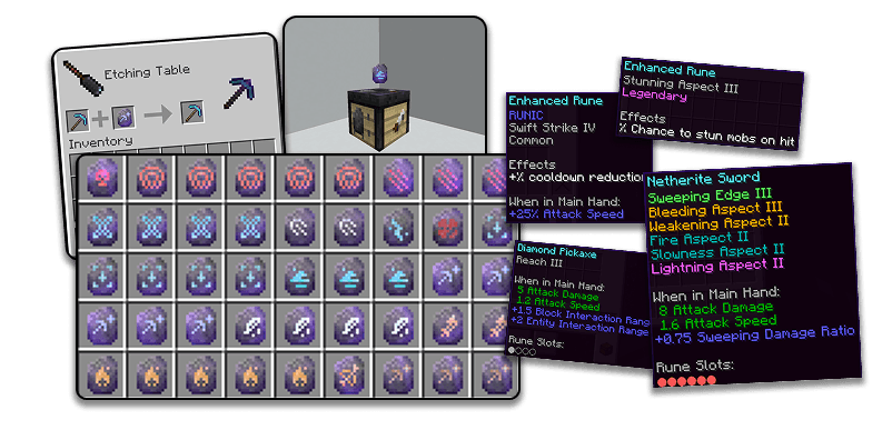 Effect enhancements work like vanilla enchants, but now only have 2 levels per enchant, level one obtained from etchings and level 2 from runes