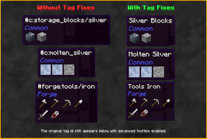 Tag Fixes currently adds 46 tags to items, blocks and fluids that are missing, incomplete or broken in their respective mod to improve compatibility between mods. Primarily modpack utility, especially ore/material unification.