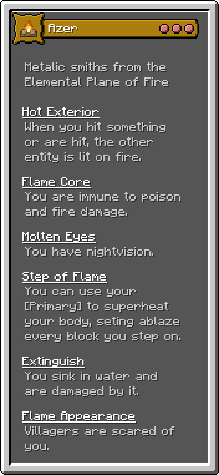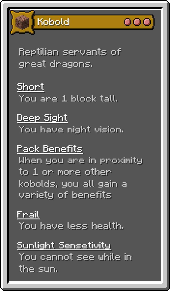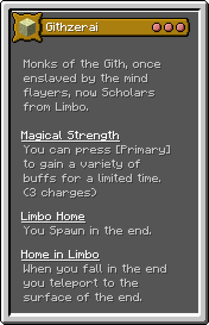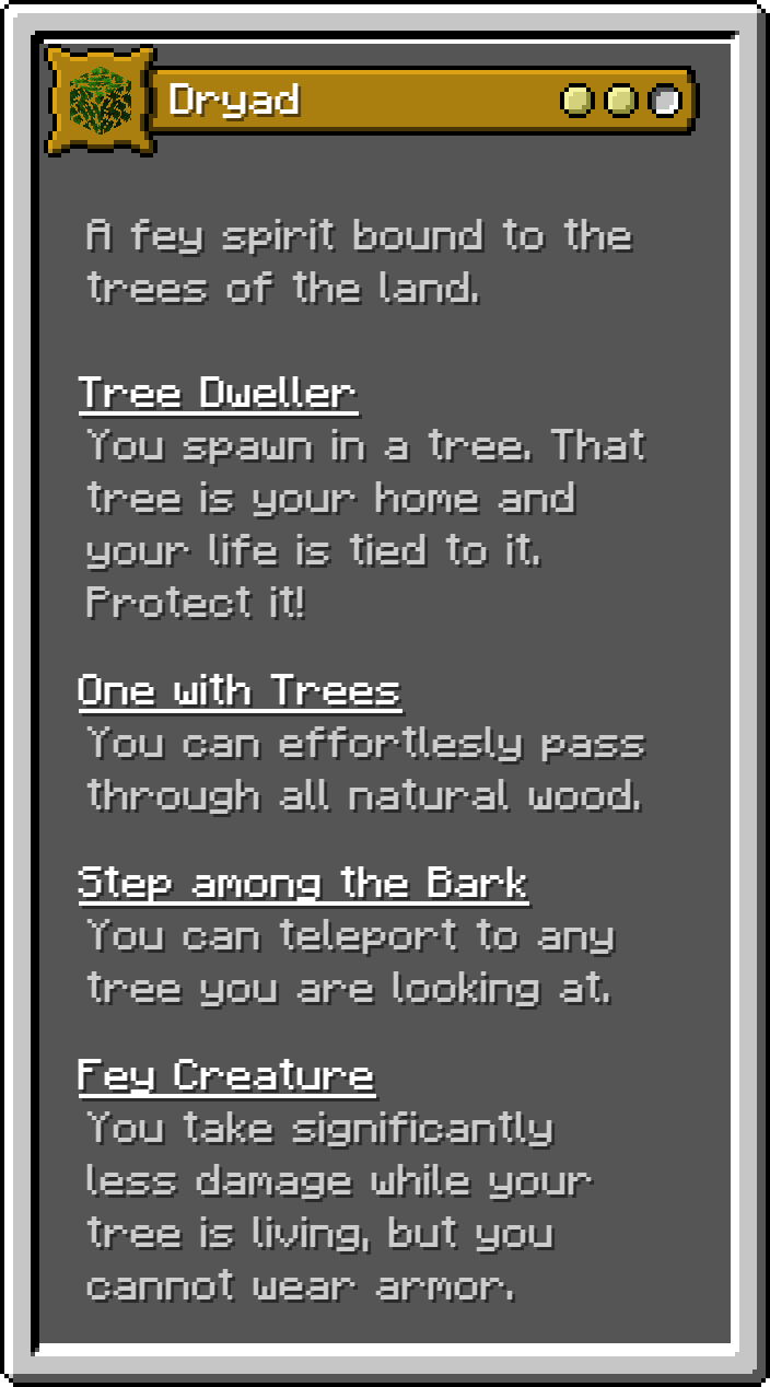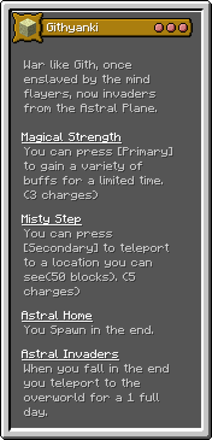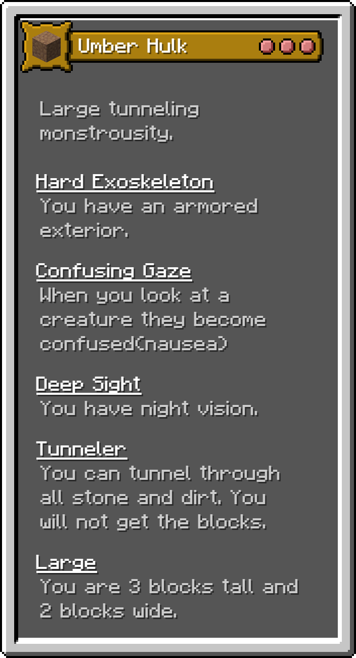 This Fabric mod adds 17 of the monsters for the D&D 5e Monster Manual into Minecraft as playable origins. These are not meant to be balanced, but true to the game.