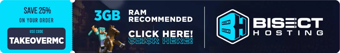 Go to https://bisecthosting.com/TAKEOVERMC and use the promo code TAKEOVERMC to get 25% off your first month!