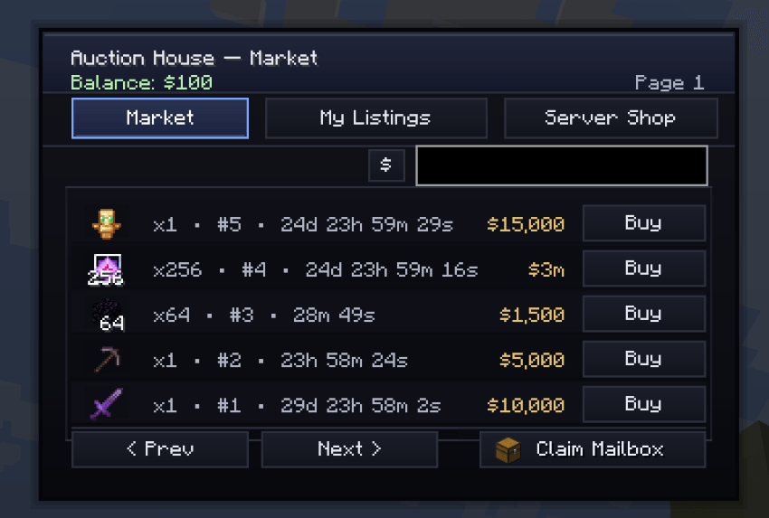 EconMC is a powerful, server-authoritative economy and auction system designed to bring the kind of polished shops and player markets seen on popular vanilla servers into your own world or modpack. It recreates the familiar experience of server shops, player-run auctions, balance leaderboards, and redeemable currency, but with full NBT accuracy, multiplayer safety, and support for modded items.