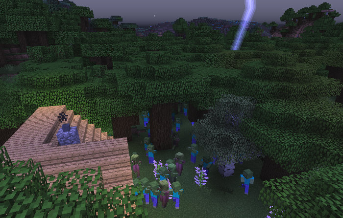 Siege can be disabled altogether or set to spawn crazy number of zombies (up to 300 per siege) without getting them stuck inside half-blocks and farm fields. Sudden lightning over spawn area can alert players that something is going on.
