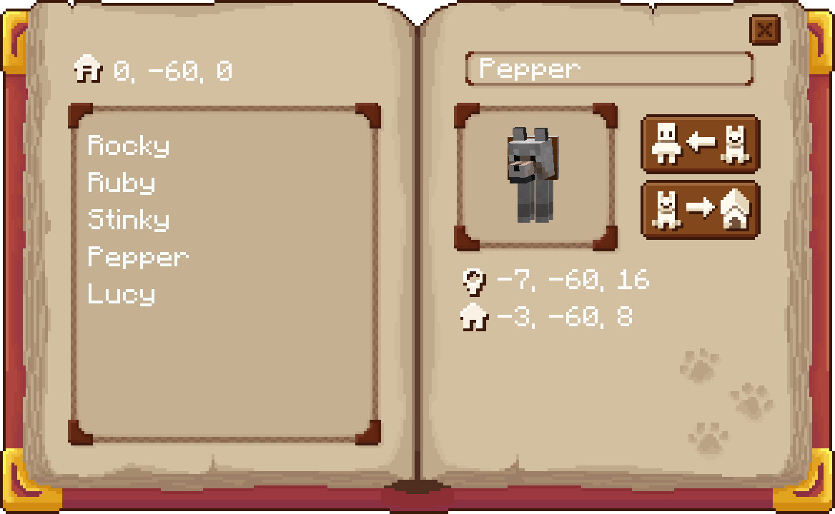 The Roster is a book that lists all of your Forever Pets. You can use the roster to view stats and summon them or send them home. The Roster includes the location of your pet, as well as its home location. You can open the Roster with a keybind (default: P).